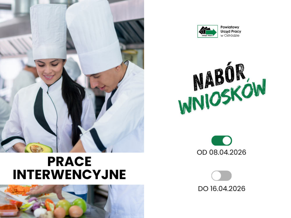 Powiatowy Urząd Pracy w Ostródzie ogłasza nabór wniosków o organizację prac interwencyjnych, który przeprowadzony zostanie od 8 do 16 kwietnia 2026 roku do godziny 13:00.